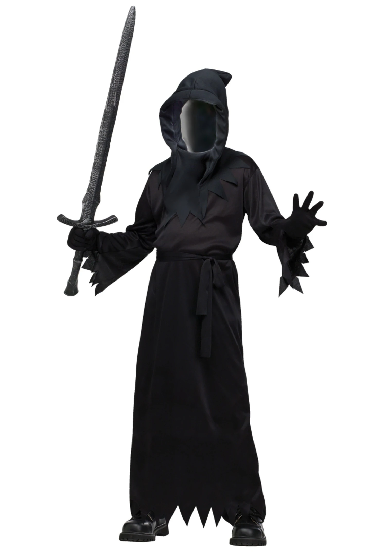 Crafted with care from 100% polyester, the robe ensures a comfortable fit while exuding eeriness with its jagged hemline and sleeve cuffs. The set is completed with wrist-length gloves that perfectly capture the ghostly essence. The hood/mask, made with precision, comes with inner foam pads ensuring a secure fit and includes an elastic band for added security.