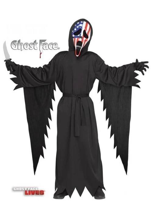 Patriotism has never looked so sinister as when you’re wearing your Child Patriotic Ghost Face Costume! The molded mask conceals your entire face and features Ghost Face’s signature curved eyes and wide-open mouth. It’s printed with red and white stripes as well as a square of star-spangled blue around the right eye.