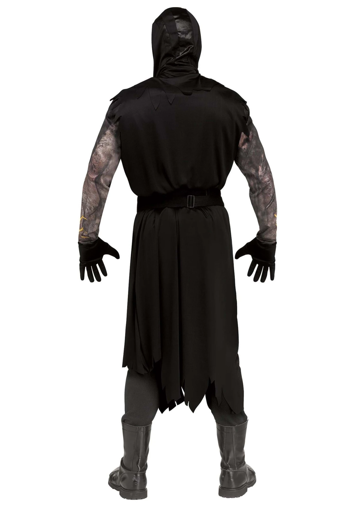 Dress as a player from the popular video game this Halloween when you wear an officially licensed Dead by Daylight Scorched Ghost Face Costume for Adults! The shadowy-printed shirt slips on over your head and looks perfect underneath the sleeveless, calf-length tunic. The black tunic has a slashed and jagged hemline and features printed graphics that look like dripping molten metal. Two wide black belts fasten around your waist and are ideal for storing your knives. The oozy-looking Ghost Face mask has an attached hood that covers your whole head, and the black gloves finish the look.