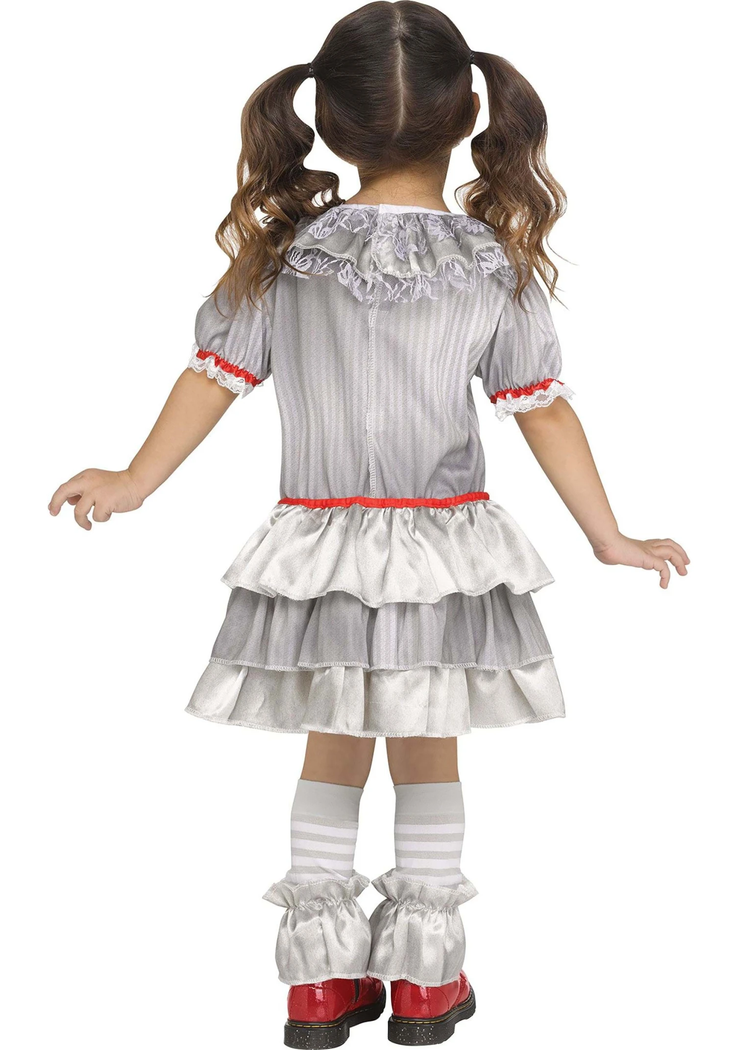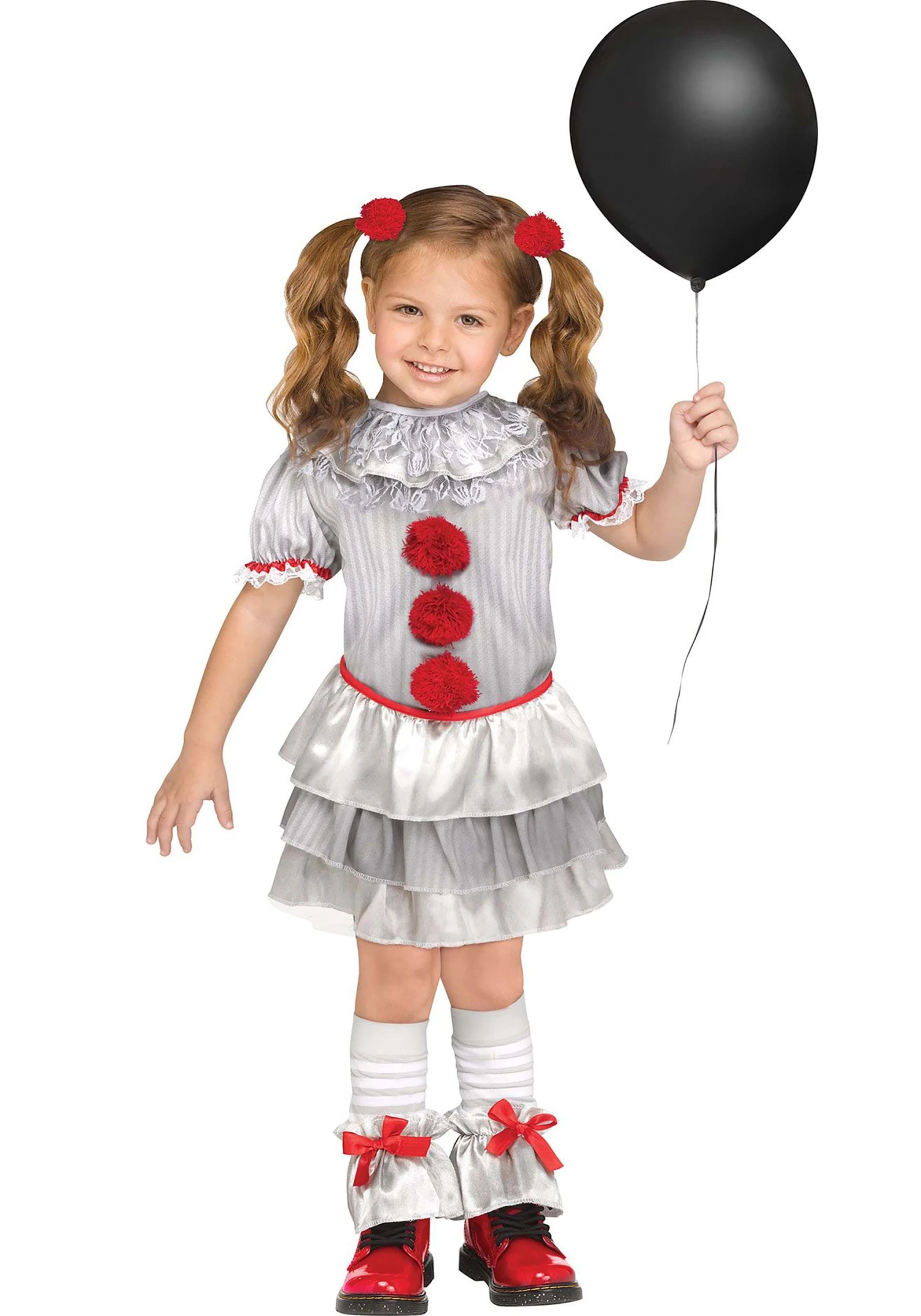 This sweet yet spooky Girl’s Carnevil Clown Toddler Costume is perfect for Halloween fun! The short dress fastens at the back and features a bodice printed with grey and white stripes. A row of oversized red pom-poms is sewn to the center front. Its wide collar and puffed, red-trimmed sleeves are edged in lace. The skirt’s contrasting tiers are made of grey-and-white-striped fabric and shiny, solid grey material. The striped leg warmers end in solid grey ruffles that are embellished with bright red ribbon bows.