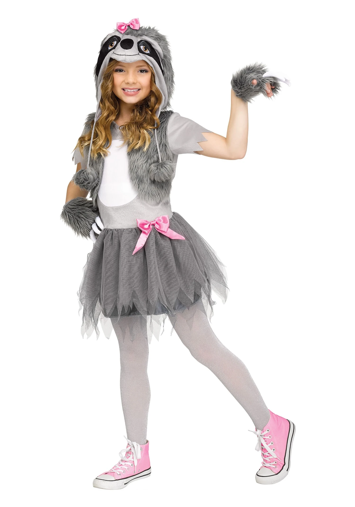 You’ll be even more adorable than your run-of-the-mill rainforest sloth when you wear this Girls Sweet Sloth costume! The outfit’s short-sleeved top is a soft grey with the cutest white spot on the front – cutting-edge color contrast that the sloths perfected long before fashion designers began to use it. The attached skirt has a grey liner beneath puffy grey tulle layers that are perfect for twirling. A lovely pink bow accents the waistline. Top it off with the furry sleeveless vest. It has an attached hood featuring a smiling sloth face. A matching pink bow adorns the head. Add the furry fingerless gloves complete with well-groomed white claws, slip on your favorite pair of pink shoes, and your transformation is complete!