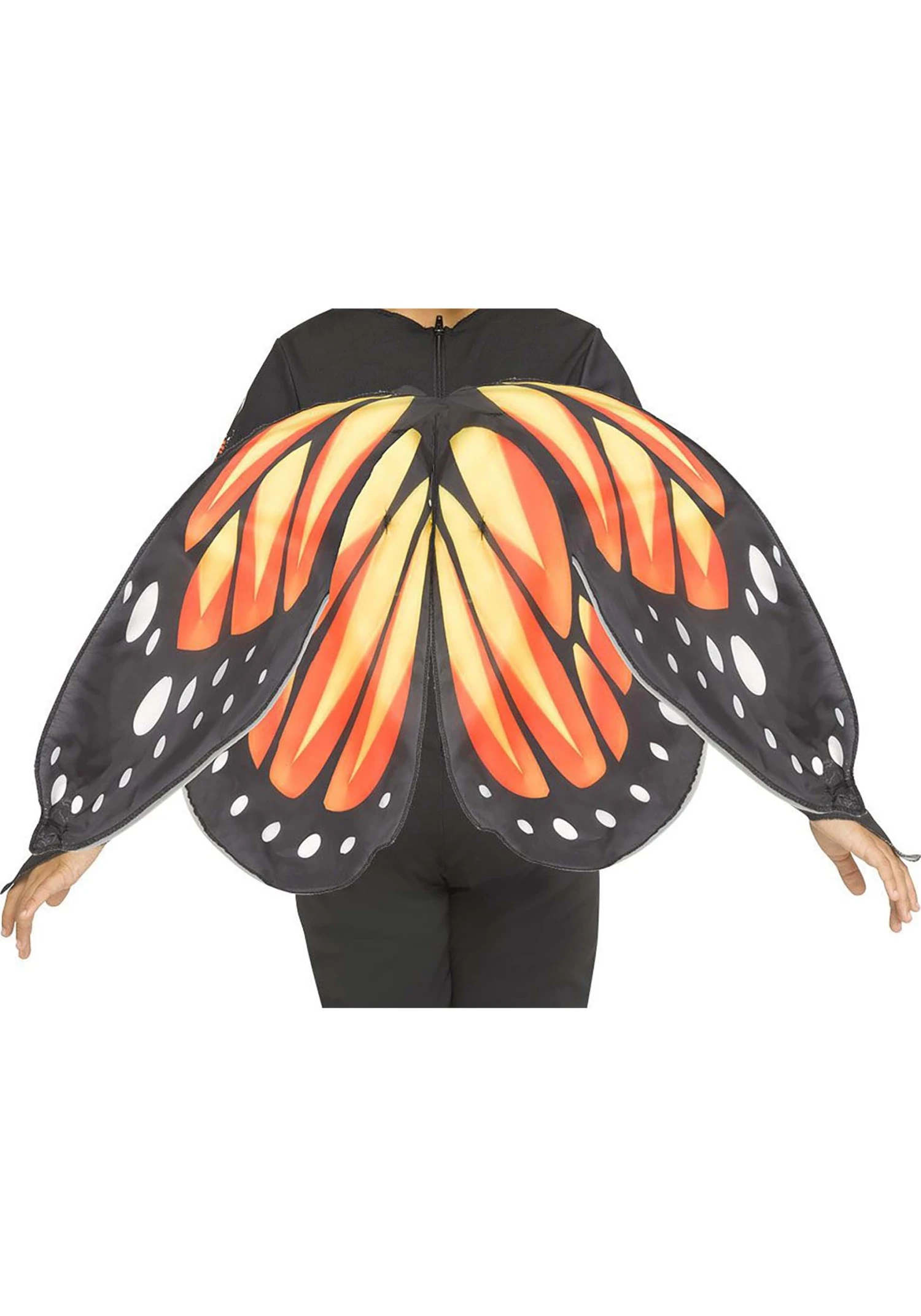 Be creepy yet cute in a uniquely awesome Girls Buttefly Bones Costume! The costume’s jumpsuit fastens down the back and is made of soft black jersey knit. The front of the suit is printed with realistic skeleton graphics as well as orange and yellow butterflies. It comes with a set of fabric butterfly wings that feature elastic shoulder straps and finger loops, and display beautifully contasting orange, yellow, black and white colors. A headband decorated with faux butterflies completes your costume.