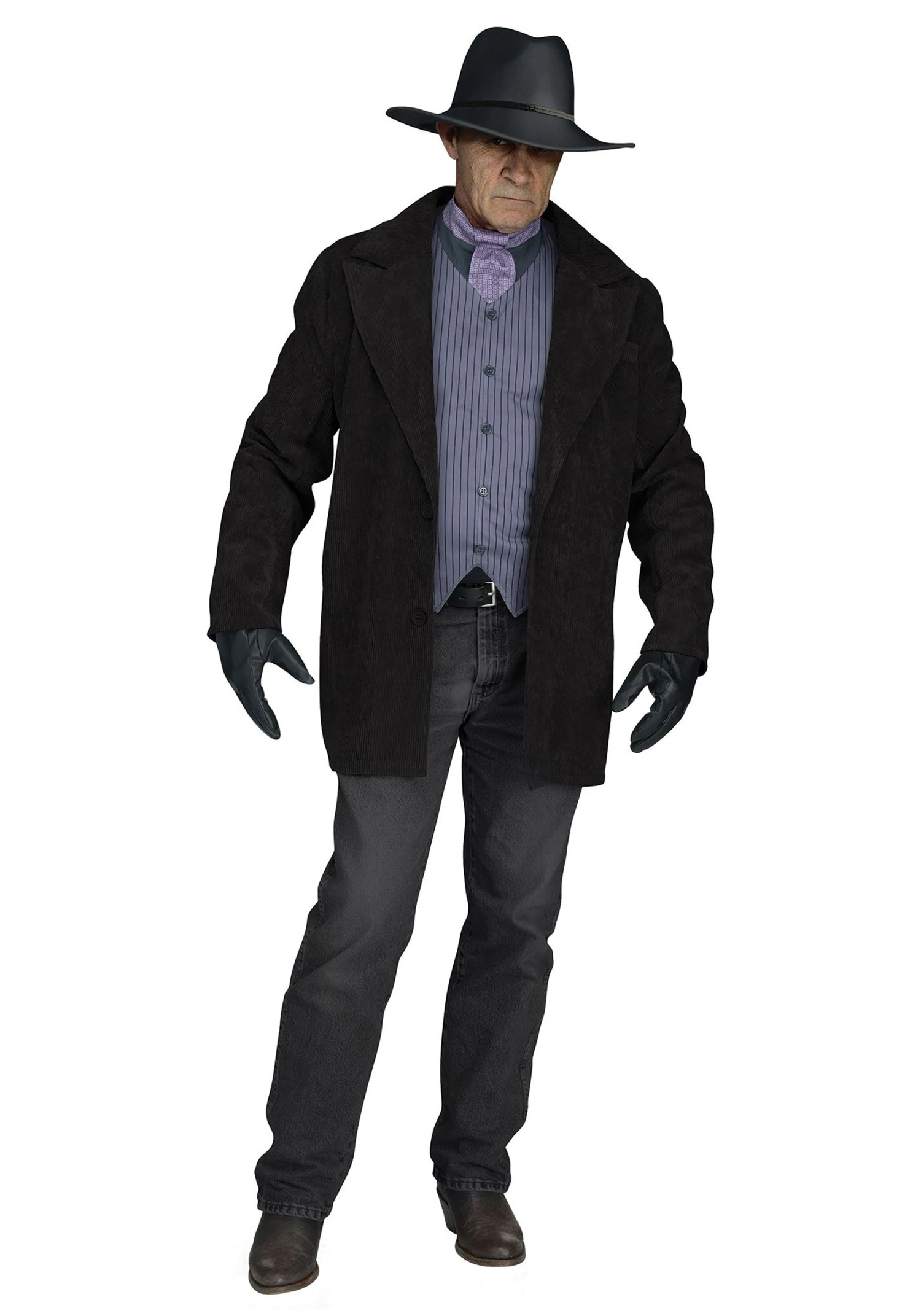 This dark but classy outfit is just the right mix of edgy and elegant. The black jacket has a velvety, corduroy texture. The vest, shirt, and necktie underneath are actually a sleeveless one piece, so it looks like you are wearing all of the old-fashioned layers without any of the weight. No need to worry about tying this tie, because it’s sewn in and stops at the vest! The values are merely decorative. Finish of the look with the sleek black hat and faux leather gloves. Looking for more Wild West accessories? Check our website for belts, holsters, flasks, stick-on mustaches, and more!