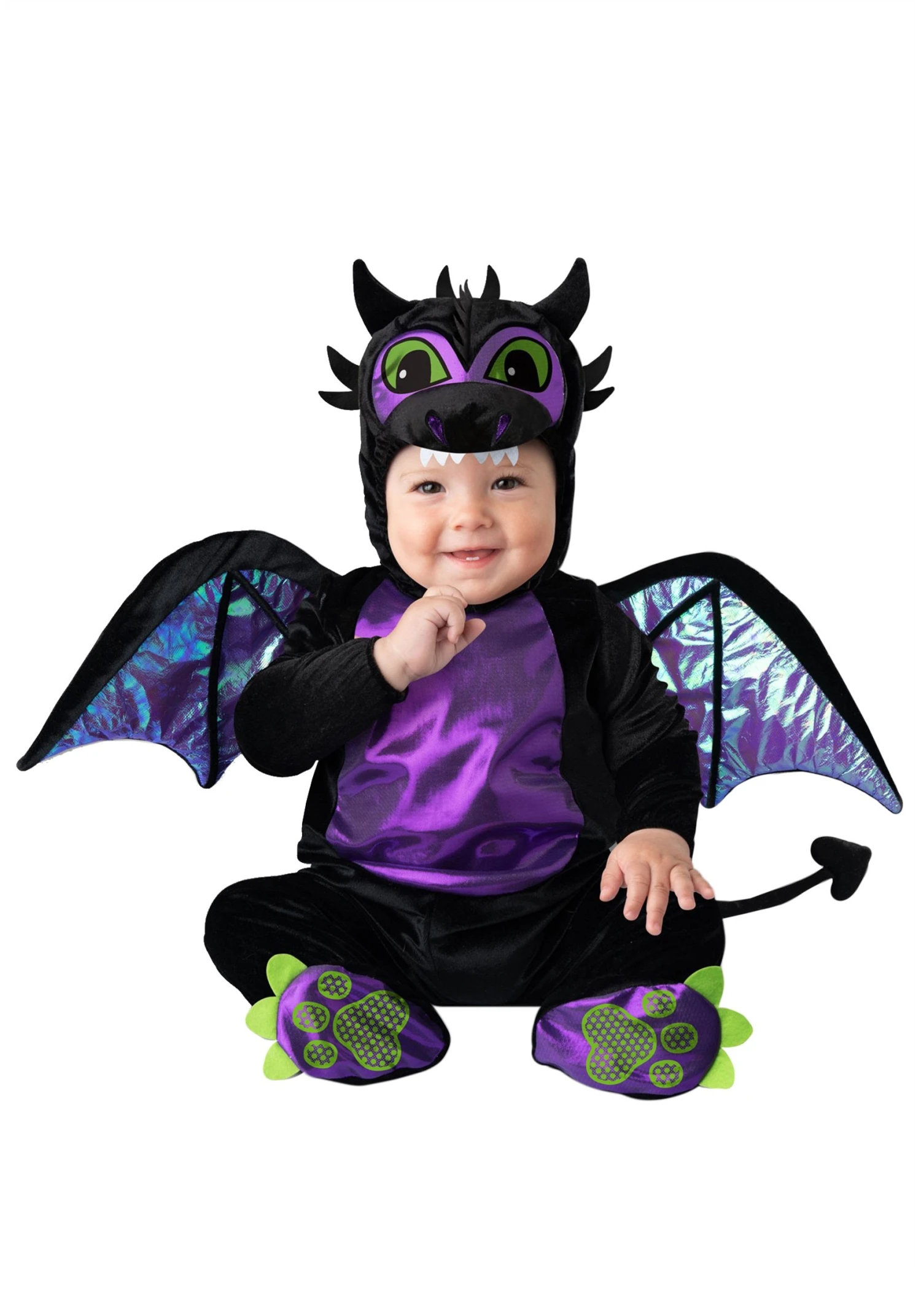 It is time to claim your title and give your little one the time of their draconic lives with this Infant Dragon costume. This is a jumpsuit with metal snaps along the inseams and rubbery booties. Of course, the fun of the look is in the shiny purple and black design, the foam-backed wings, and the soft-sculpted dragon head hood! The tail has a heart-shaped tip. Each component has hook and loop fastening in case you need to downgrade your little draggo to lay them down for a dragon nap, too!