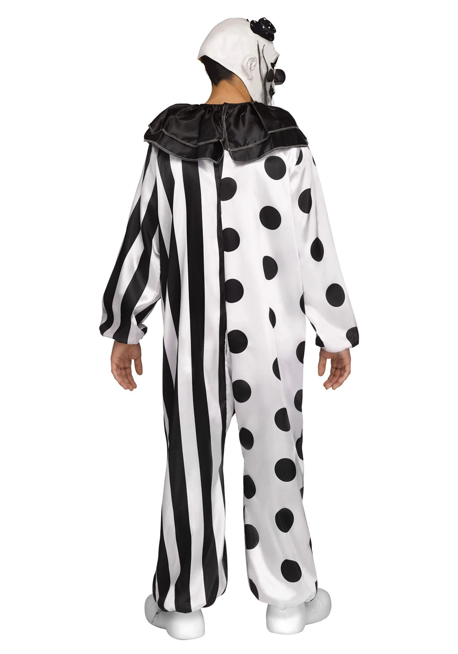 Not to be outdone, the ruffled collar, which ties effortlessly, ups the eerie factor. The showstopper, however, is the molded latex mask. Covering the entire face and the top of the head, the mask features a chilling clown face, complete with attached wild hair and a mini top hat. It’s truly the stuff of nightmares!
