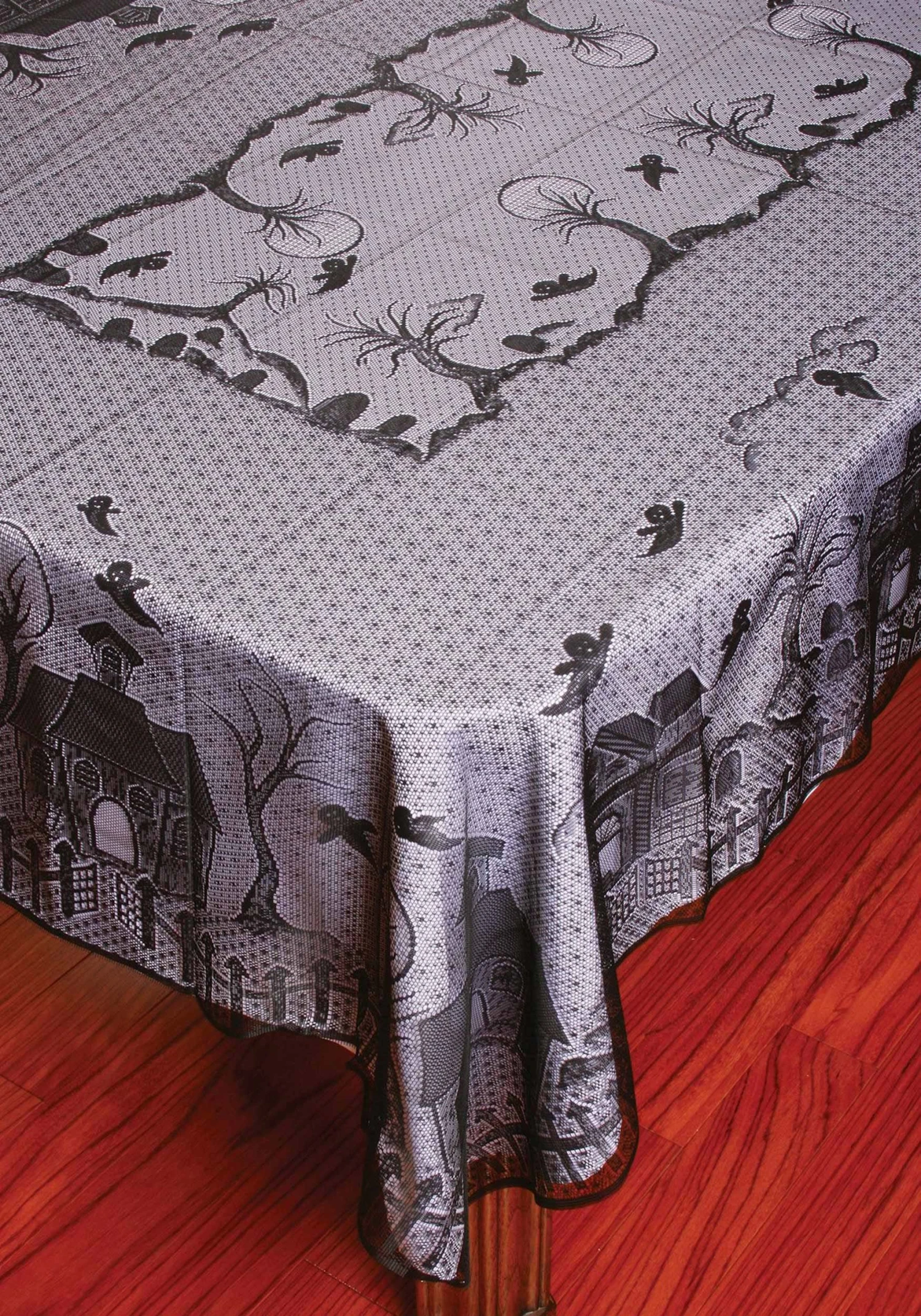 - Tablecloth has images of haunted houses, spiders, webs and more