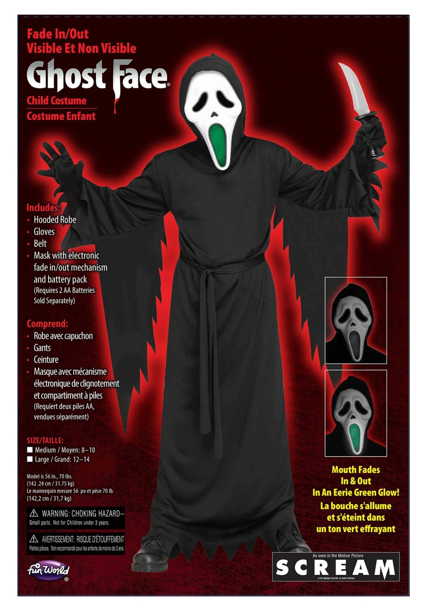 This Child Light Up Fade Mouth Ghost Face Costume will probably not inspire sudden interest in a boring conversation, but it does look pretty awesome. The black robe with its jagged edges looks a like a perfect match for the original Ghost Face, and the light up mouth will just add to the illusion that you should be feared.