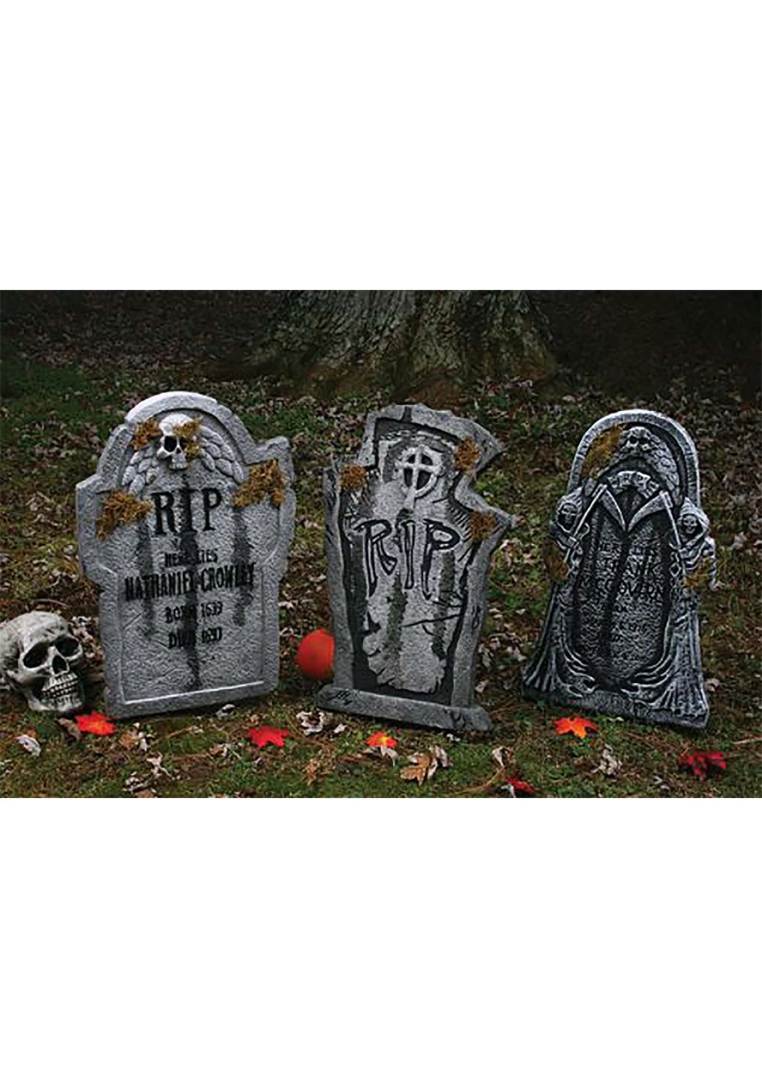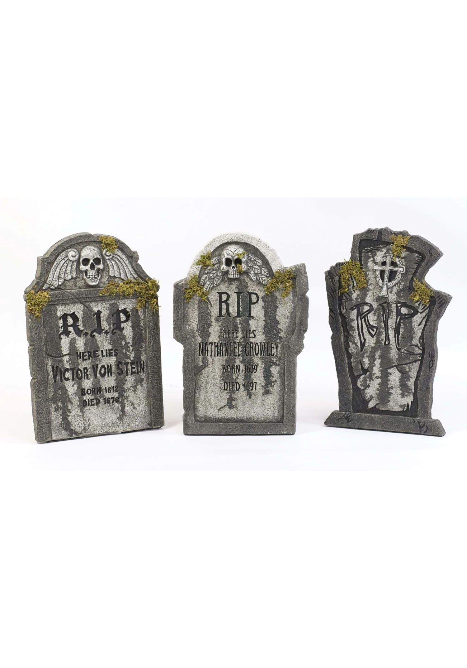 Make your front yard graveyard exciting again with these individually packed RIP Cross Tombstone with Moss decorations! Featuring three different inscriptions and shapes, these Halloween props are the mystery that could liven up even the oldest cemetery. Order your faux stone today to discover which restless spirit wants to join your decorative collection!