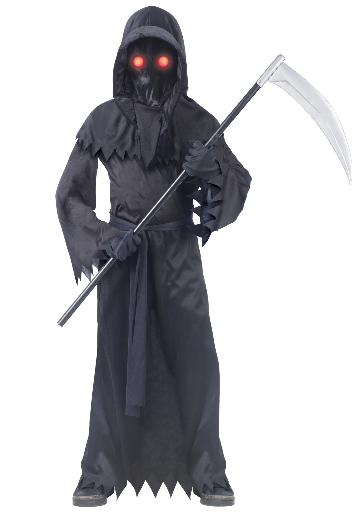This kid’s costume is a simple outfit that comes with everything your child needs to transform into one freaky ghost! The costume comes with a black robe, which has jagged cuffs and a matching jagged hemline to recreate the attire of a wandering soul. It fits with fabric ties at the back of the neck. The belt is made out of matching black fabric and ties around the waist. The hood has padding in the front and a mesh front for limited vision. Finally, the costume comes with a pair of glasses, which light up. They fade in and out to create an extra-eerie effect! Put it all together and you have a look that will be scaring all of us phasmaphobes!