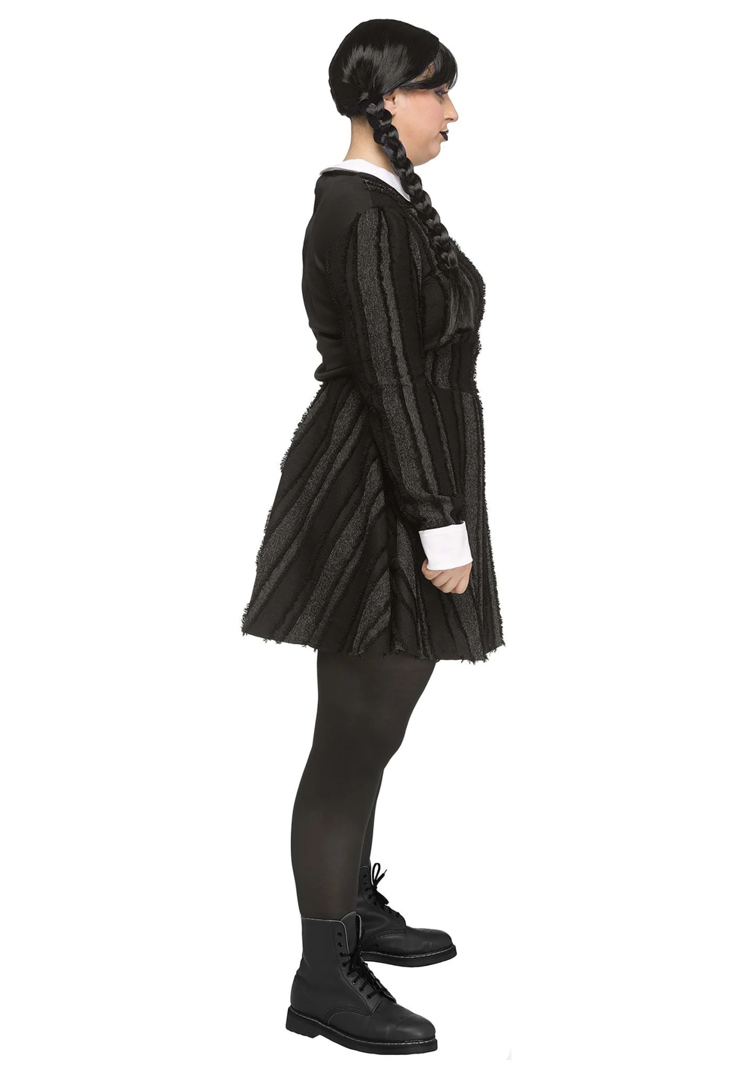 Fill friends and strangers with a vague feeling of unease when they see you wearing this Plus Size Creepy Coed Costume for Women! The minidress is made of soft, comfortable material and features an old-fashioned, pointed white collar as well as a row of black values up the center front. It’s printed with a series of black and grey stripes that are separated by textured black piping. Wear your favorite pair of black combat boots and plait your hair in pigtails to finish your look!
