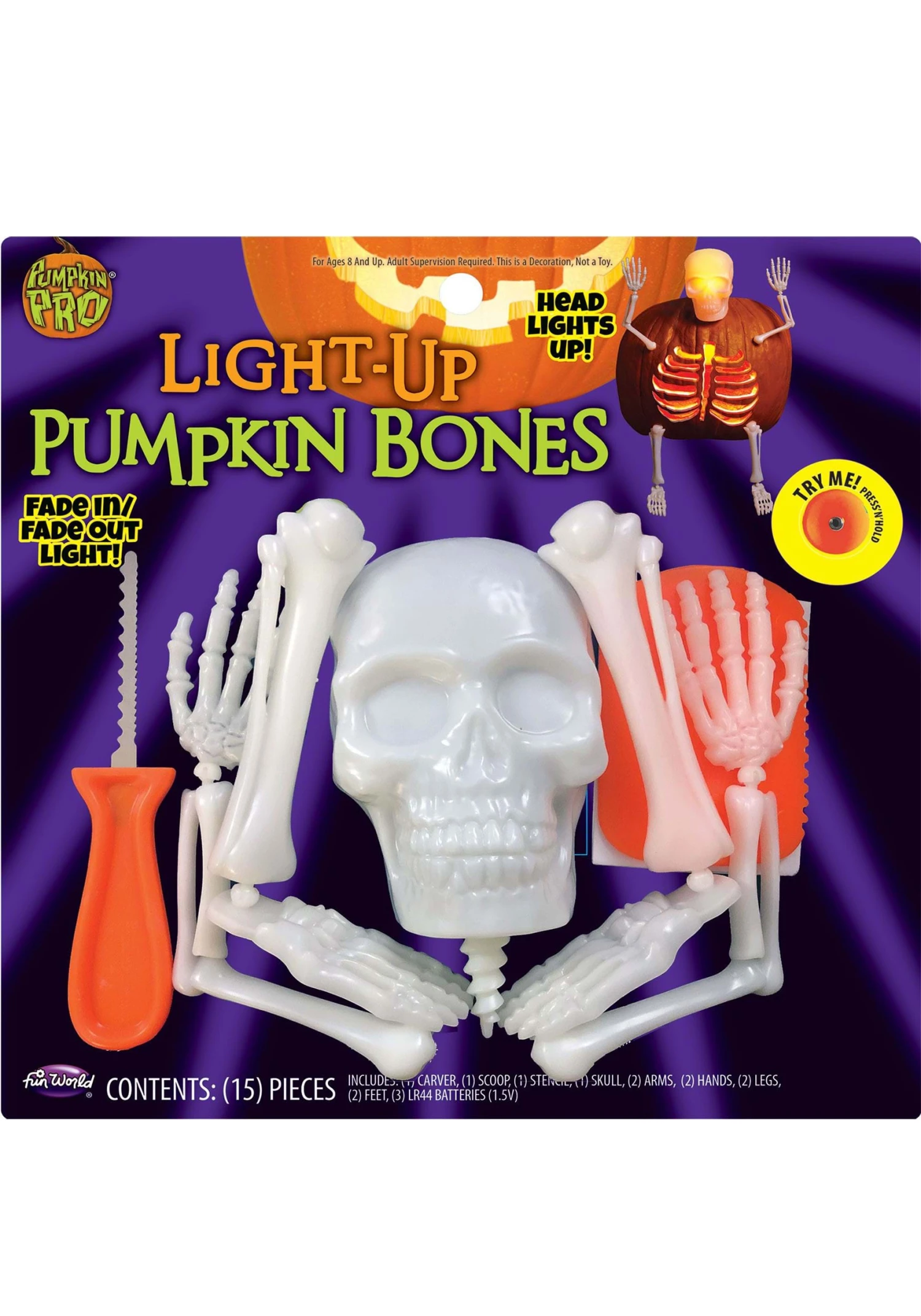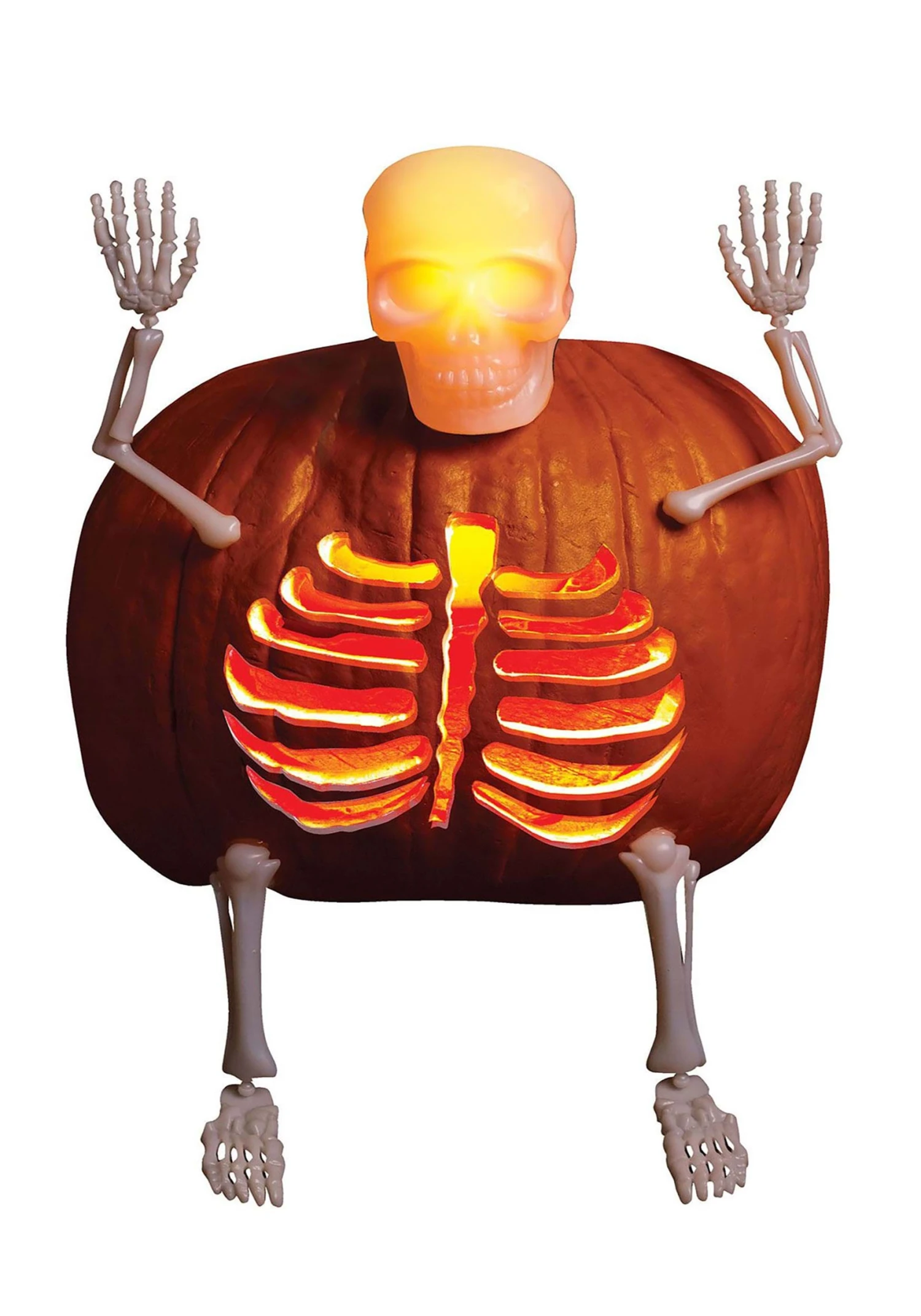 You’ll be dying to show off your finished product after you use this Pumpkin Light Up Bones Carving Kit! The set contains a pumpkin-carving tool, a ribcage stencil, and a scoop, as well as two plastic arms, two plastic legs, and a light-up plastic skull. Batteries are also included.
