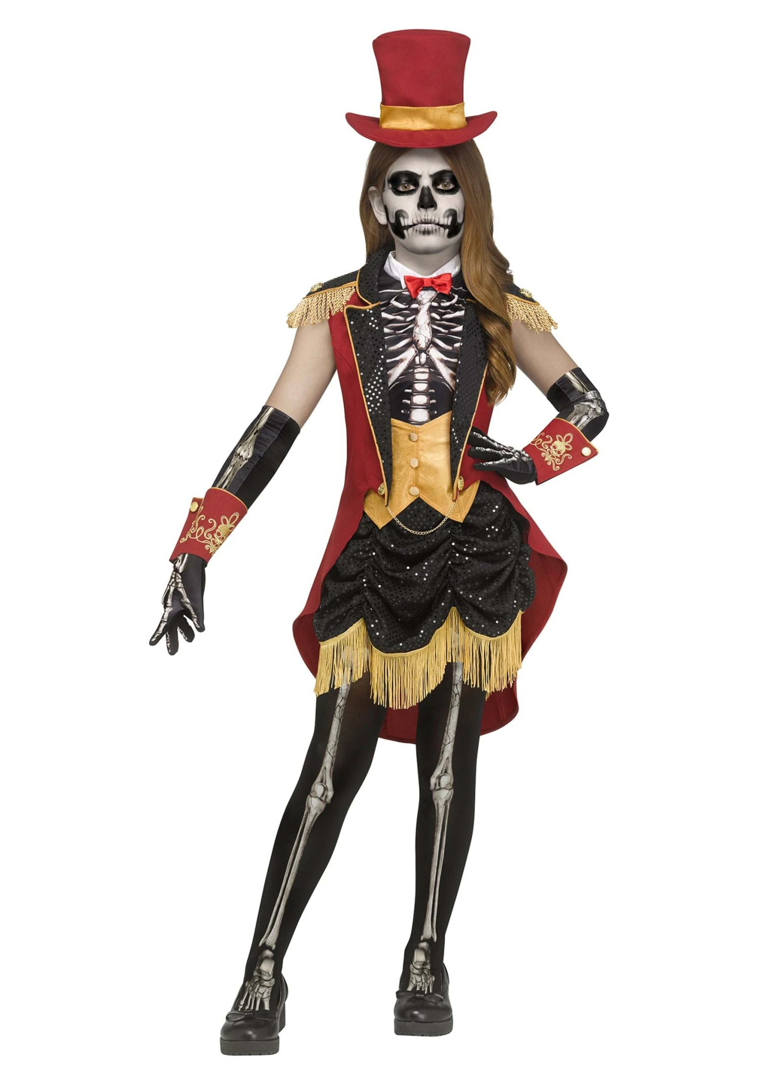 That’s where this Girl’s Skeleton Ringleader Costume comes in! It’s the perfect blend of spooky and fun for your child’s next Halloween party. This deluxe set starts with a dress that designed to make the wearer’s chest look creepily skeletal. The gathered skirt has details that shine, like black sequins and luxurious gold fringe.