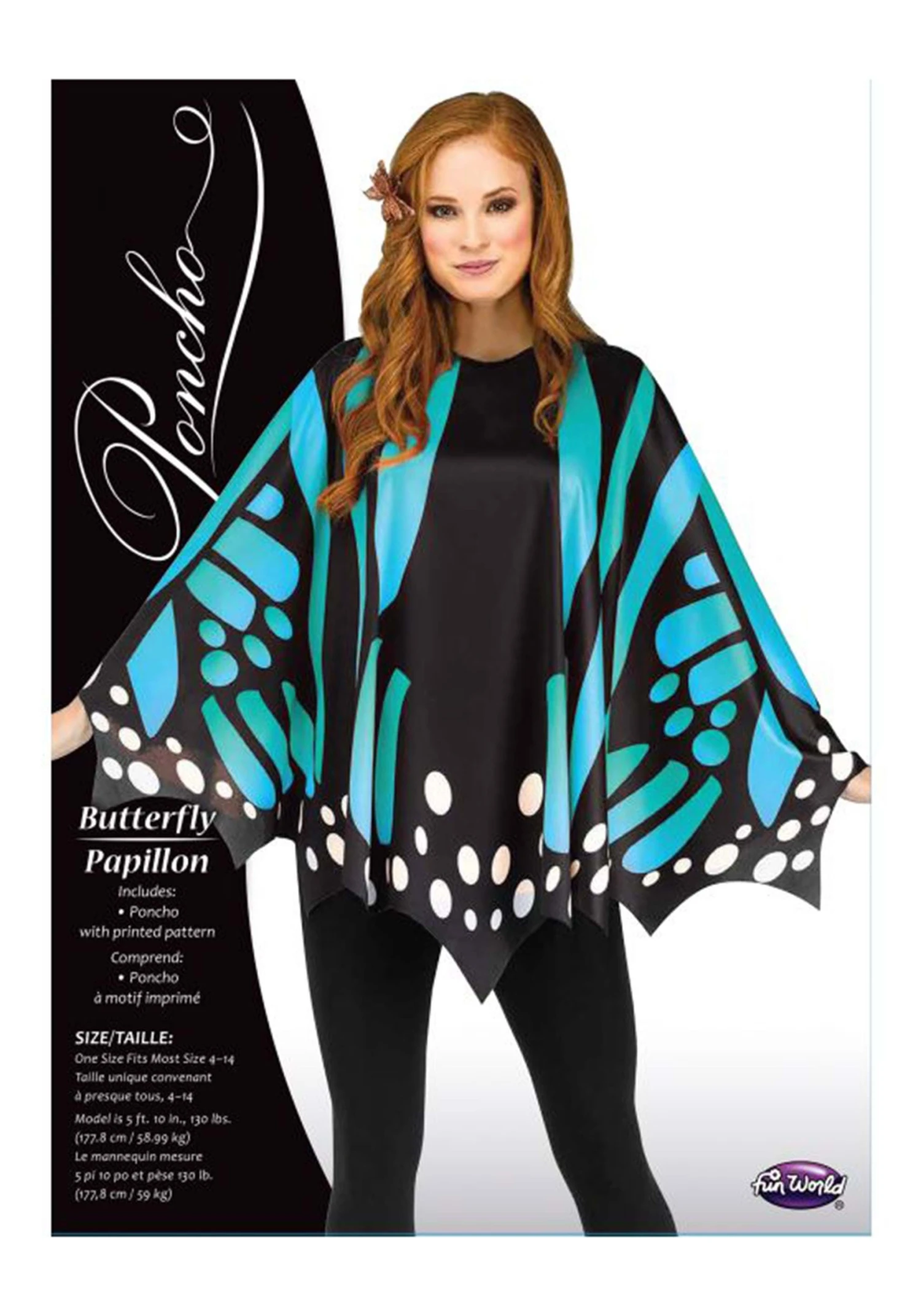 This gorgeous poncho is part fashion statement, part costume. It’s a pretty cut with drapey sleeves and a jagged-edge hem. The print is a beautiful teal blue butterfly pattern, and it covers the poncho front and back. Get ready to take flight!