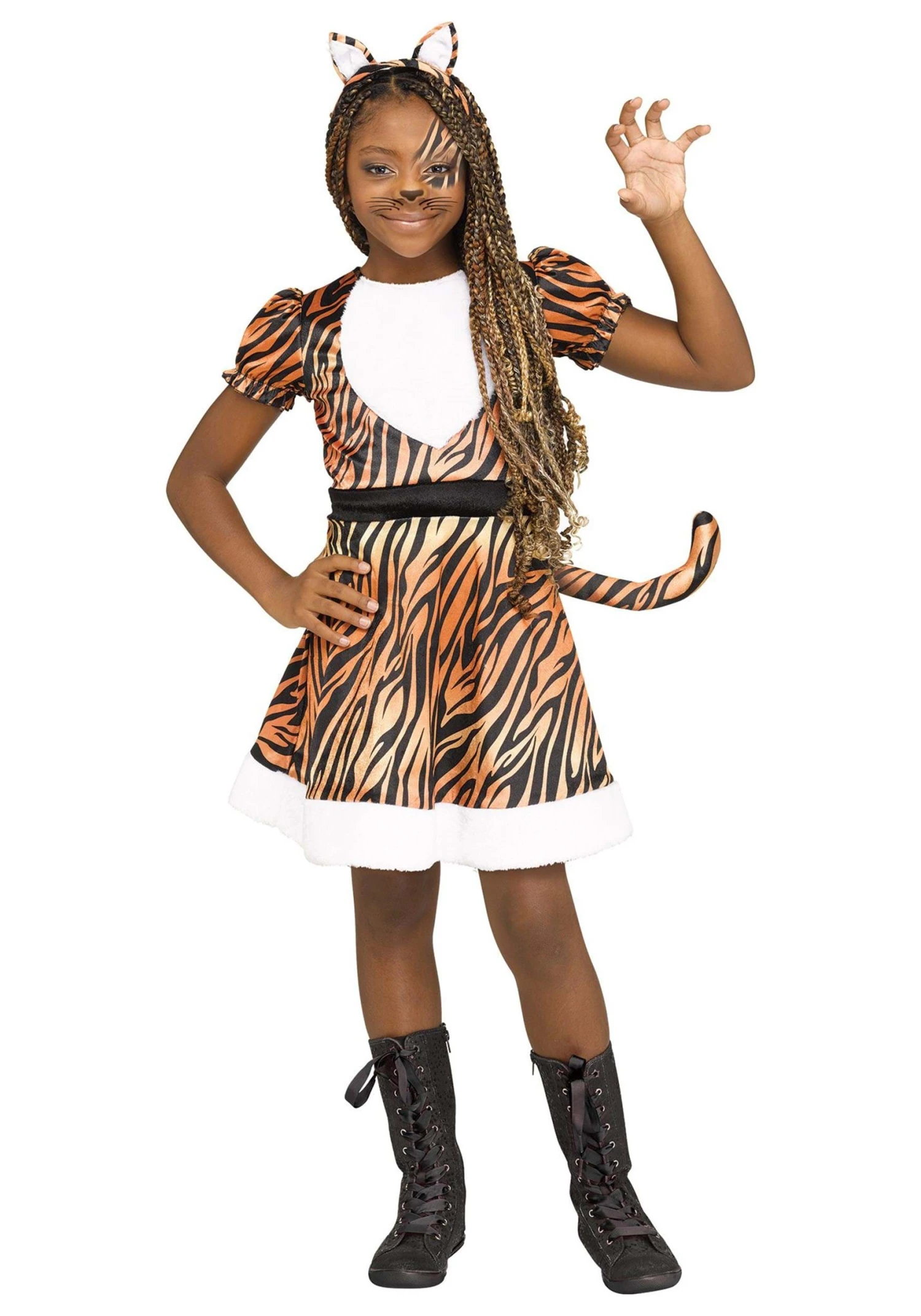 Well, now there is! This Girl’s Tigerrr Costume includes a dress with the beautiful, regal pattern of the amazing tiger. Its tail affords you the extra balance that helps tigers run, climb, and swim with such perfect feline grace. The camouflage helps give you that fabled cat-like stealth. The only thing left for you to do is to practice your growl and grow some claws!