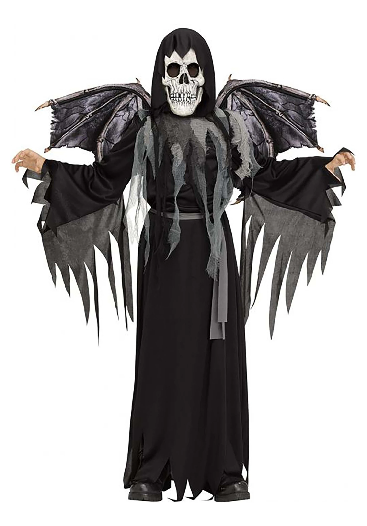 Reap the rewards of Halloween in a Winged Grim Reaper Costume for Boys! The long black robe has a slashed hem and jagged gray streamers sewn to the long sleeves. The neckline trails more streamers of gray to give you a smoky, mysterious appearance. A gray sash can be tied around your waist. Tattered-looking bat wings with a skeletal frame stretch out from your shoulders. Put on the skull mask and pull up the costume’s attached hood to hide your true identity!