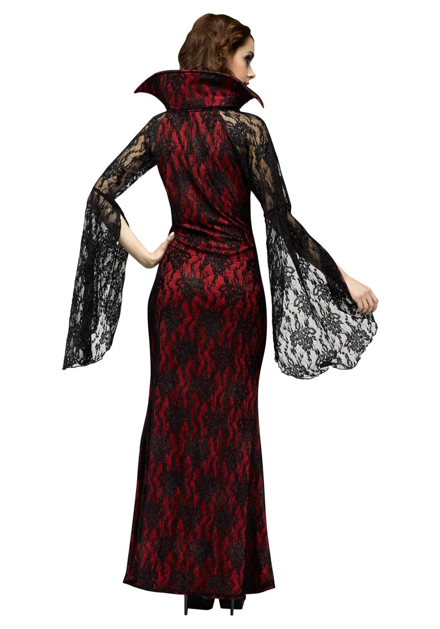 Offer your willing (and fearful) subjects a visage of your glory in this Elegant Vampiress costume. The pullover dress has an adjustable string corset in the front and features a lovely pattern of sheer lace and glitter that overlays the vivid red gown. A Victorian cowl rises from your neck and the deep neck allows you to display clearly any remaining vampire nibbles or offers the perfect place for an ancient-looking vampiric pendant. Oh, Noble Majesty, have mercy on we simple plebeians, for your elegance will surely earn you any victim of your choosing this night!